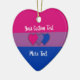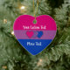 Ceramic Christmas ornament shaped like a heart with the bisexuality pride flag with little hearts in the center of the design. Pink, purple, and blue flag of the bi pride movement; with an editable text field for your name or message; a great way to decorate your Christmas tree :D