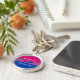Premium round keychain with the bisexuality pride flag with little hearts in the center of the design. Pink, purple, and blue flag of the bi pride movement; with an editable text field for your name or message