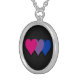 Silver Plated Necklace with hearts design in colors of bisexuality; pink, purple and blue stripes pride flag, rainbow love design, on black background