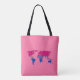 Tote bag with a map of the world in the colors of bisexuality pride flag with rainbow stripes of pink, purple and blue; ace pride design on pink background by pinkbrickroad