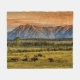 This photo features a herd of bison roaming free as the sun rises in front of the Grand Tetons.