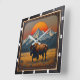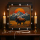 This illustration features a majestic bison walking through a field of tall grass. In the background, a striking mountain range is silhouetted against a large, stylized orange and red sun. The entire scene is framed by a dark, tooled leather border, giving it a powerful, rustic feel.