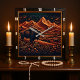 This illustration features a powerful bison standing in a field with a dramatic mountain range behind it. The artwork is rendered with a tooled texture and a striking color palette of deep black and a glowing, copper-like orange. The scene is set at night under a starry sky with a large, glowing moon or celestial body, giving it a mystical feel.