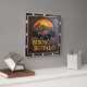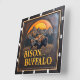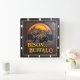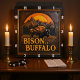 This artwork showcases a magnificent bison standing in a field with a towering mountain range behind it. The illustration is framed by a tooled leather border. The entire piece has a dramatic, rustic feel, and includes the text "BISON,, BUFFALO" at the bottom.