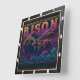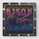 This illustration features a powerful bison or buffalo in a field, set against a background of a mountain range at sunset. The entire artwork has a distinctive tooled leather texture with vibrant neon colors in the sky and a dark, rustic foreground. The words "BISON,, at the top.