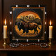 A stylized illustration of a buffalo in its natural habitat, set against a stunning mountain backdrop. The piece has a distinct tooled leather texture and a palette of warm, glowing colors. The powerful silhouette of the animal dominates the foreground, while the text "BISON," adds to the design.