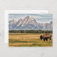 This photo features a solitary wild bison walks in front of the Teton mountain range in Jackson Hole, Wyoming.