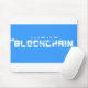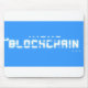 A big text message on a digital light blue screen with a heavy distortion glitch fx: Blockchain.