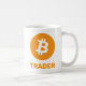 On the front and back of the mug, there's an image of the Bitcoin logo with the text 'trader' beneath it.