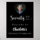 A welcome poster for a 70th birthday party. Black background. Personalize and add a name and photo. Heart shaped photo frame.