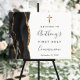 The left-hand edge of this elegant welcome sign features a black watercolor agate border trimmed with faux gold glitter. A faux gold foil cross appears above the customizable text, which combines handwriting, copperplate and italic fonts in charcoal gray on a white background. Personalize it with the name of the guest of honor and the date. Ideal for a boy's First Communion.