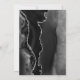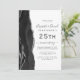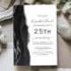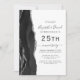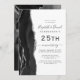 The left-hand edge of this elegant modern wedding anniversary party invitation features a black watercolor agate border trimmed with silver faux glitter. The customizable text combines charcoal gray handwriting, copperplate and italic fonts on a white background. The reverse side features a matching black and silver agate design.