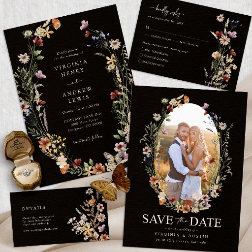 Moody Black Boho Wildflowers Wedding InvitationsDesigned by Wendi R