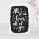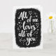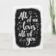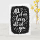 This greeting card features a deep black painted rectangle centered on a white background, with slightly rough edges that look like brush marks. In the middle, the text reads “All of me loves all of you” in flowing white cursive-style lettering that stretches across the black area. The letters vary in thickness and have gentle loops, giving the message a soft, romantic feel. Small white outline hearts are sprinkled around the words, and a few are worked into the lettering, including a heart near “of me” and another that rises from the word “loves.” The simple black-and-white color scheme keeps the focus on the loving message and the sweet heart details. Overall, it feels warm, sincere, and perfect for a partner or someone you care about 💕❤️.