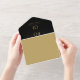 An elegant black and gold minimalist all-in-one wedding invitation featuring your special date and wedding details set in classic, chic typography. The invitation includes a perforated RSVP card with your wedding website QR code and details. Designed by Thisisnotme©