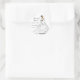 The sticker is made on wonderful paper and had no problem sticking to the bag that I purchased to put it on. I wanted to find a design that would be cute for the bride and groom and this one fit the bill as it has cute "bees" buzzing around and the wedding was taking place in a town called "Bee Cave". The packaging was great and protected the stickers. The website is easy to navigate and there are so many color choices. I had no problem finding a color that the bride was using on everything else selected. The design was adorable and there were many to choose from. You can make the figure as larger or smaller and you can place the photo and writting whereever you want to in the sticker. The printing is fabulous..better than expected.