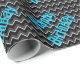 Black and blue boy's happy birthday wrapping paper. Zigzag black and gray stripes with bright blue "happy birthday" text.