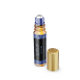 A product label for perfume roller bottles featuring a black and blue glitter design. This label contains space for your product name, business name, product weight, ingredients, instructions, and business address. You will need to use scissors to cut out each label.