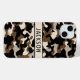 Customize this black and brown camouflage iPhone 15 plus case with your name in a trendy modern CAP font in black on cream. It's masculine and perfect for your favorite military, hunting, country or outdoorsman!