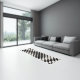 Bold geometric pattern of black and cream squares form a checkered pattern.