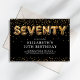 Modern 70th birthday invitation featuring a stylish black background, a scattering of gold glitter confetti, gold hellium balloons that spell "seventy", and a elegant party text template that is easy to personalize.