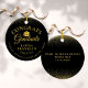 An elegant graduation ornament keepsake gift featuring your grad's details and special message on the reverse set in chic typography on a black and gold glitter background. Designed by Thisisnotme©