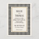 Set the tone for a modern wedding where the guests all wear black and white, the reception is at a jazz club with art deco, speak easy vibes, and everyone drinks Negronis and dry martinis while swaying to the music of a jazz band. Inspired by the timeless checkerboard patterned floors that have appeared in architecture since the first century, the black and white check motif has popped up over and over again through the ages. Turned forty five degrees and used as a frame, this motif feels upscale and fashion forward. This budget friendly postcard wedding invitation is a great choice for the money conscious couple with a modest quest list and a strong sense of style.