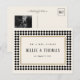 Set the tone for a modern wedding where the guests all wear black and white, the reception is at a jazz club with art deco, speak easy vibes, and everyone drinks Negronis and dry martinis while swaying to the music of a jazz band. Inspired by the timeless checkerboard patterned floors that have appeared in architecture since the first century, the black and white check motif has popped up over and over again through the ages. Turned forty five degrees and used as a frame, this motif feels upscale and fashion forward. When the chime of wedding bells has faded and the honeymoon is over, send your guests a note of appreciation with these budget friendly postcard thank you notes. Easily edit the text for your event and add a favorite wedding photo, your guests will love seeing your happy faces and reading how much they mean to you.