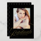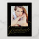 Elegant graduation announcement featuring the graduate's senior photo and "graduate" in a gold foil modern calligraphy script with a black background. Personalize the photo graduation announcements by adding the graduate's name, school name, and graduation year. The back of the graduation announcements features a stylish black and white trellis pattern.