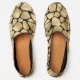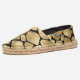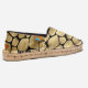 A bright gold and tan giraffe print on a black background makes an interesting and unique pattern on these espadrilles.