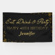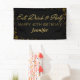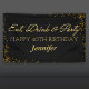 Elegant unisex birthday party banner featuring a stylish black background that can be changed to any color, with the words "eat, drink and party" in a faux gold foil script and a simple text template.