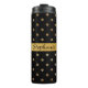 Chic Thermal Tumbler done in black, with golden glitter looking polka dot pattern. A gold band, runs across the middle of the tumbler, with custom black text ready to personalize. Great gift idea for her.