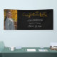 Modern graduation party banner featuring a stylish black background, a photo of the graduate, gold sparkly glitter, the word "congratulations" in a bold ornate gold script, the graduates name, school, and class year.