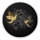 Black and gold jewelry hummingbirds on gray background decorated with plants. Jewelry birds. Golden bird. Gold bird.