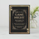 This Game Night party invitation features a classic playing card design on a black background. An ornate, vintage style frame surrounds the center text area. A matching gold foil design frame borders the invitation. Two gold diamonds and the King monogram are printed in opposite corners, similar to the layout in a deck of cards.