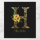 Beautiful couples/family monogram with a dramatic flair features gold decorated letter H with pretty watercolor sunflower bouquet, customizable gold modern text on black background