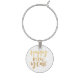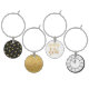 These wine charms feature the following four designs: a black clock with Roman numerals on a white background, gold on white "happy new years," gold stars on a black background and solid gold. Perfect for New Years Eve or any other formal gathering.