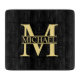 featuring personalized gold monogram in classic serif font style with box of name in the middle of monogram on black background.