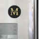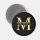 featuring personalized gold monogram in classic serif font style with box of name in the middle of monogram on black background.