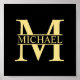 featuring personalized gold monogram in classic serif font style with box of name in the middle of monogram on black background.