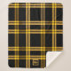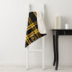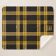 This plaid tartan blanket features a bold and classic black and gold design, creating a warm and stylish look. The intersecting lines form a grid-like tartan pattern with a rich texture that adds sophistication. A customizable monogram box is positioned at the bottom, allowing the initials (currently “MW”) to be replaced with your own, making it a thoughtful gift or a personalized home accessory.