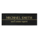 This name tag features name in gold professional serif font style and title in gold classic script font style on black background.
