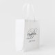 Wedding favor welcome bags with a minimalist couple's monogram in a fancy calligraphy script in gray and black.