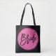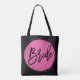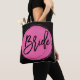 Bride all-over-print tote bags for wedding, bachelorette party or bridal shower with pink text printed on black background. Tote bag is made of polyester and measures 16 inches by 16 inches and the strap measures 28 inches.