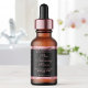 This dropper bottle product label features a black background, pink text, and a pink faux foil border. This label measures 2.375 inches long by 1.25 inches high (60 mm long by 38 mm in height) and is a great choice when you are looking to package essential oils, fragrance oils, face serums, hair serums, and other products in standard 0.5 ounce or 1 ounce glass dropper bottles.