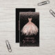 Elegant dress seamstress business card, with graphics of a pink glitter dress, against a black background, with pink glitter looking accents. Personalize the text to suit your business needs. A lovely stand out card for your tailoring business.