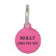 This pet tag has a black circle on the middle with a customizable monogram letter. The background color is pink with white small dog paws pattern. On the other side there are customizable text areas for the name of your pet and for your phone number.