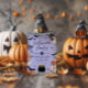 Invite your guests to a Halloween party with this cute invitation featuring spooky Halloween symbols on a light purple background and personalized black typography.