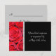 Bright red roses dress up the left side of this wedding response card. Your text is on a dramatic black background, and is separated from the rose image by a silver "ribbon". The back of the card is gray to make it easy for your respondents to mark. **Please note - the image is printed on the card, which contains no actual fabric or ribbon.** There are several matching products in my store; click on any image below to view the individual product.