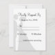 Black and white damask print with a red band, a silhouette bride and groom, and areas you can personalize with your RSVP information, couple's names and monogram initial.